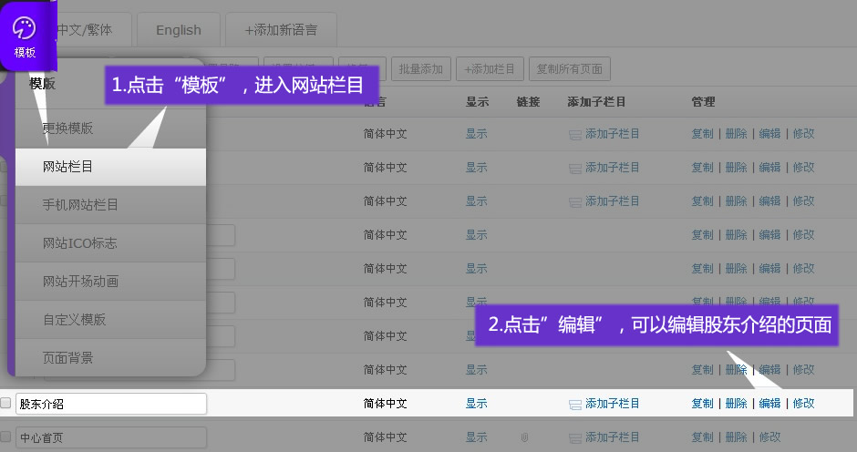 鼠標移動到左側(cè)“模板”,再點擊進入“網(wǎng)站欄目”,對相對應(yīng)的欄目編輯