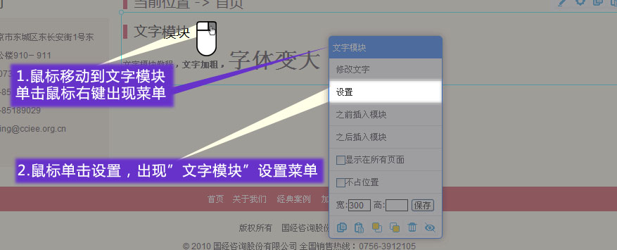 進入網(wǎng)站編輯模式,選中選中文字模塊,單擊鼠標(biāo)右鍵,在出來的菜單中點擊設(shè)置
