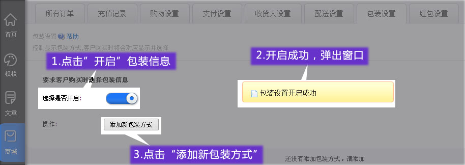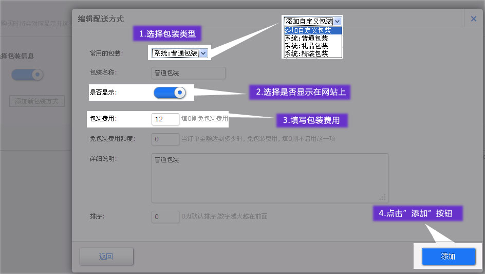 選擇包裝類型,填寫包裝費(fèi)用,并點(diǎn)擊”