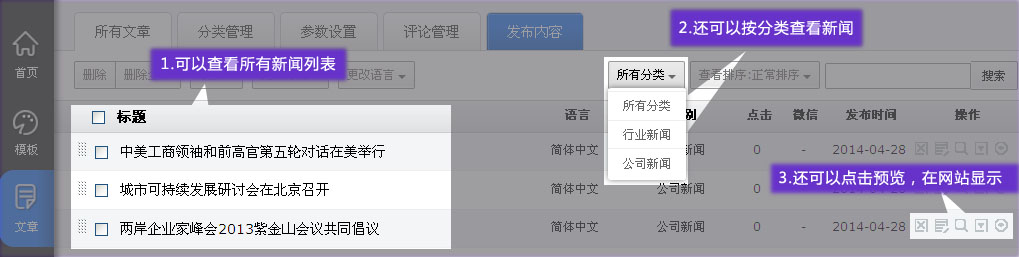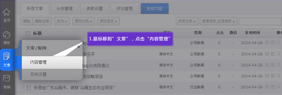 1. 鼠標(biāo)移動(dòng)到“文章”,點(diǎn)擊進(jìn)入”內(nèi)容管理“。就可以查看所有新聞列表