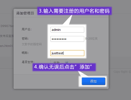 2. 點(diǎn)擊“添加管理員”按鈕,按需求填寫(xiě)