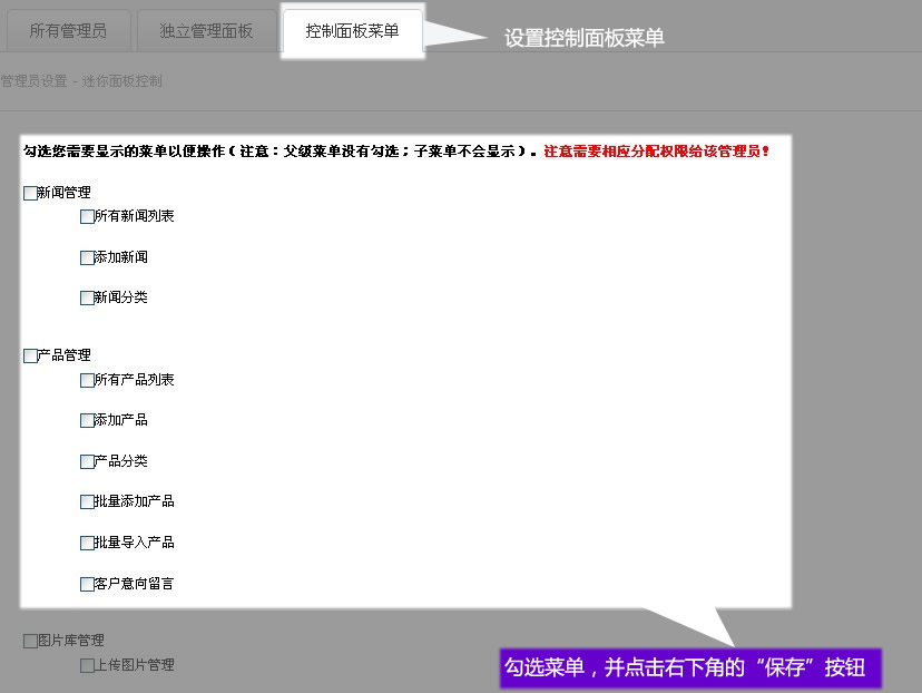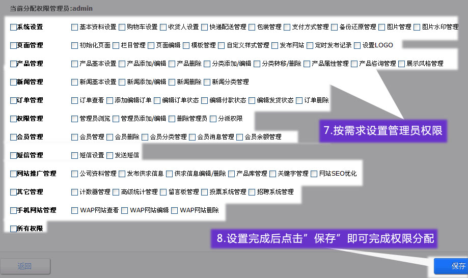 4. 按需求給管理員設(shè)置權(quán)限,點(diǎn)擊"保存"即可