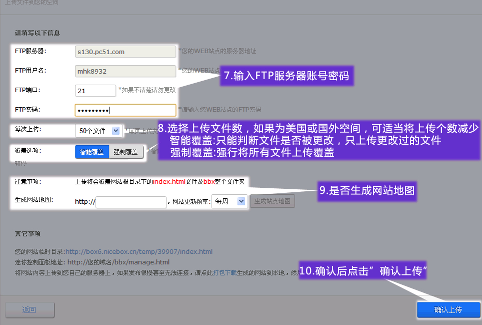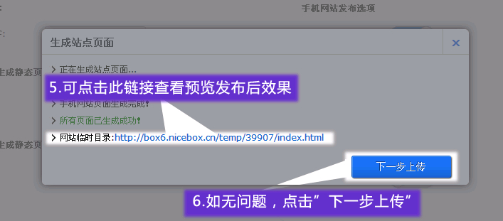 發(fā)布前,用臨時目錄查看網(wǎng)站。確定沒有問題再點擊"下一步上傳"
