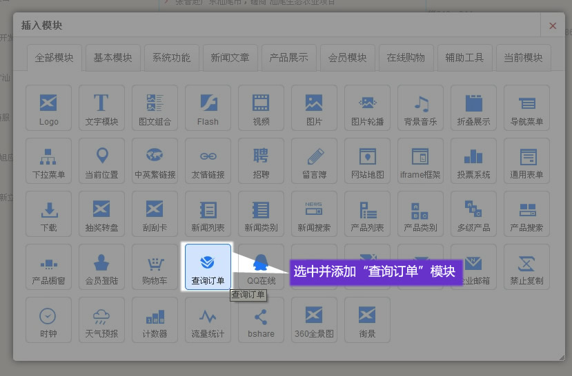 1. 在適當(dāng)?shù)奈恢,添加?b>查詢訂單”模塊